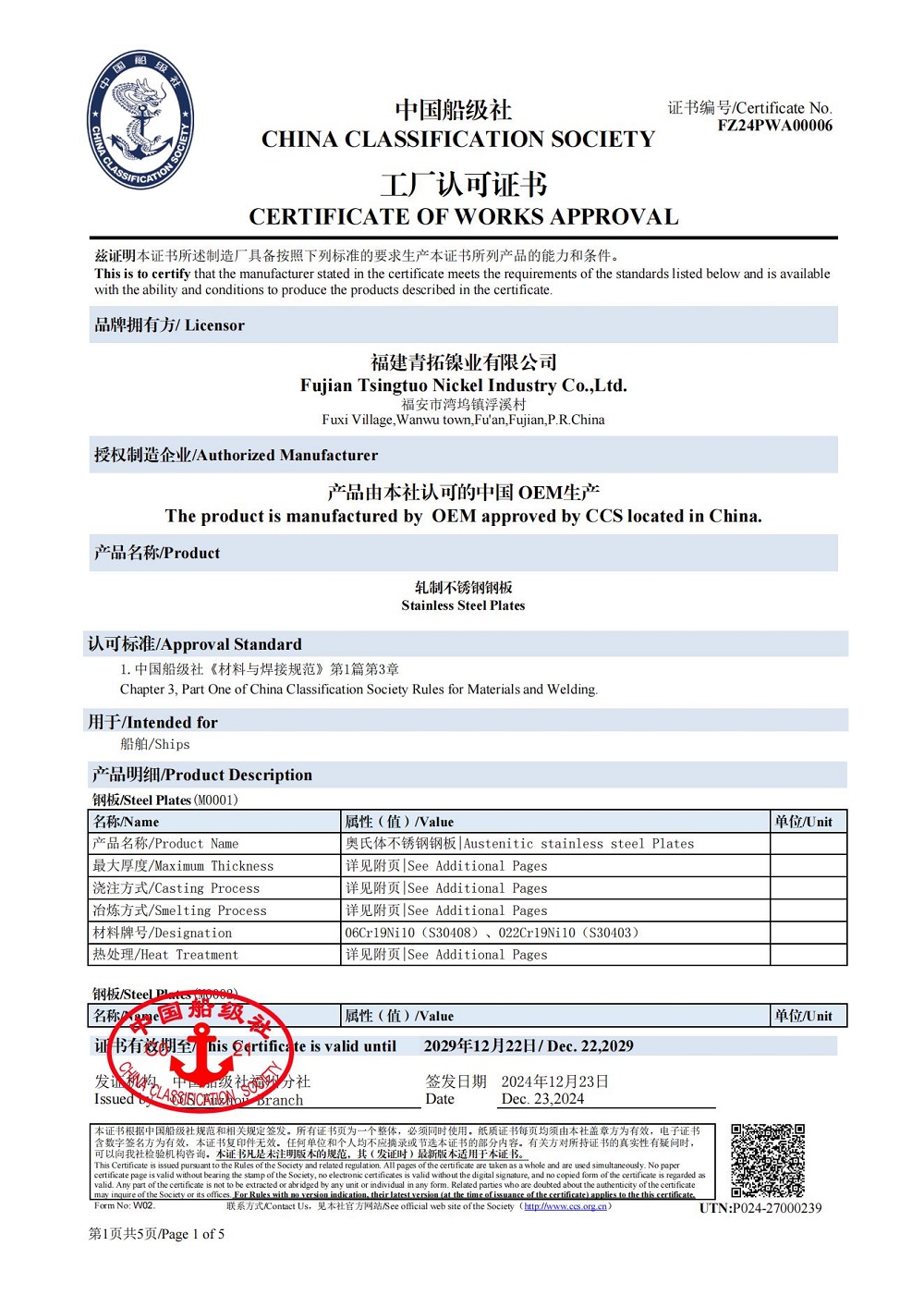 青拓不锈钢中厚板顺利通过中国船级社(CCS)工厂认可